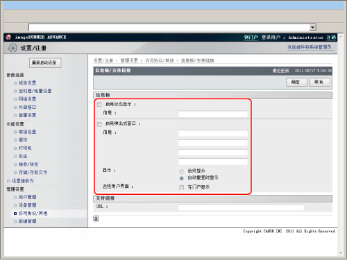 输入要在触摸面板显示屏幕上以弹出式窗口形式显示的信息、或要在“远程用户界面”的门户页面上显示的信息。最多可以输入4行信息,每行23个字符。