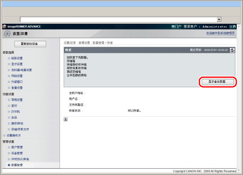 如果要显示备份/恢复日志,单击[设置/注册]→[数据管理]→[备份/恢复日志]。