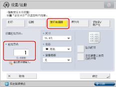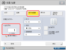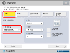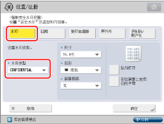 如果要从打印机驱动程序对每项作业使用“安全水印”功能,在[打印首选项]对话框上,单击[完成方式]选项卡→[高级设置]→为[设备的保密打印功能]选择[打开]。有关详细信息,请参阅打印机驱动程序的在线帮助。