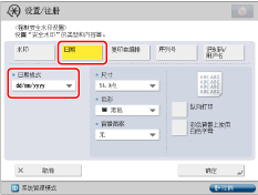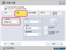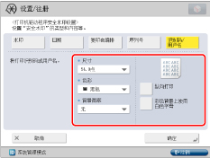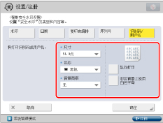 有关输入字符的说明,请参阅“从触摸面板显示屏幕输入字符”。如果已经在“设置/注册”的[功能设置]的[注册页码编排/水印字符]中注册了字符,则可以从列表选择字符。