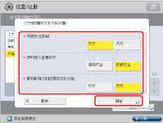 如果在尝试复印、扫描或打印包含嵌入信息的文档时设置了影响“文档扫描锁定”的功能*,则作业会取消,并且信息<因检测到嵌入信息,作业已取消。>显示在触摸面板显示屏幕上。