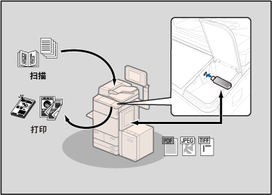 可以使用本机扫描原稿并以PDF、JPEG、TIFF或XPS等文件格式存储,还可以随时使用所需打印设置从本机打印存储的文件。
