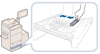 滑动前导板直到其发出“咔哒”声。如果没有按纸盒中添加的纸张尺寸正确地调整前导板,则正确的纸张尺寸可能不会出现在触摸面板显示屏幕上。