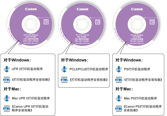 打印机驱动程序从用户软件光盘进行安装。如果有多个光盘,请使用以下信息作为参考并选择正确的光盘和打印机驱动程序。
