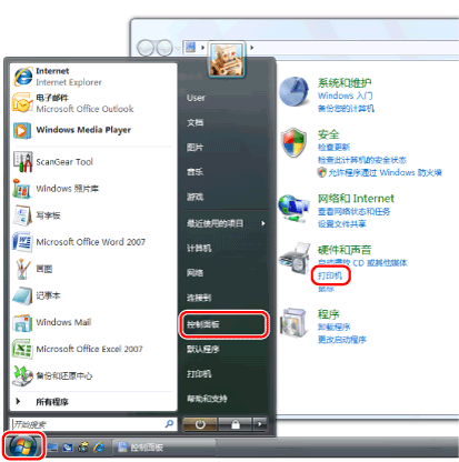 对于Windows XP Home Edition,单击[开始]→[控制面板]→[打印机和其他硬件]→[打印机和传真]。