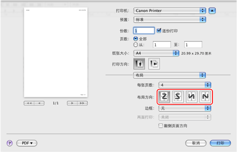 选择打印机→[布局]→从[每张页数]中选择要打印在一张纸上的页数。