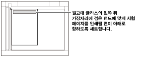 화살표 옆 원고대의 왼쪽 뒤 가장자리에 있는 검은 밴드에 맞춰 인쇄될 면이 아래로 향하도록 하여 원고대에 테스트 페이지를 세트합니다.