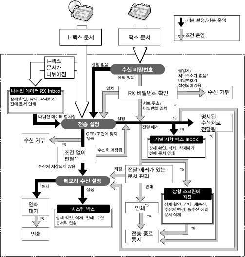 *4 [기능 설정](설정 등록)의 [전송설정]에서 [조건없이 전송등록]을 설정한 경우 지정된 전송 조건과 일치하지 않는 모든 수신 문서는 조건없이 전송 등록에서 선택된 수신인으로 전송됩니다.