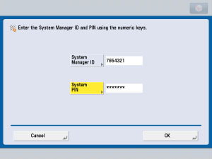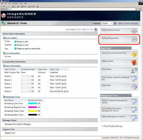 (설정/등록) → [환경 설정] → [네트워크] → [TCP/IP 설정] → [키와 증명서]에서 [SSL 설정]을 누르고 → [기본 키] (사전 설치된 키 쌍 및 서버 인증서)를 선택하고 → [사용키로 설정]을 누릅니다.|
