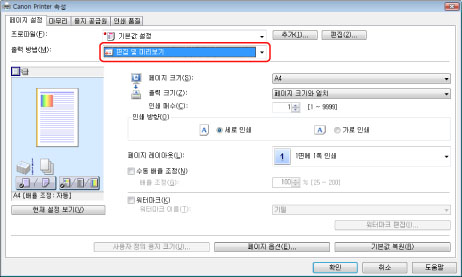 [출력 방법] → [편집 및 미리보기]를 선택합니다.