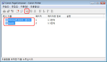 [Canon PageComposer] 대화 상자가 표시됩니다. 결합된 문서가 문서 리스트에 표시됩니다.