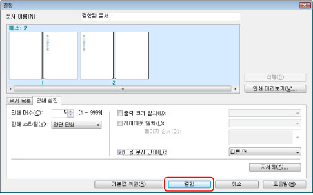 인쇄 미리보기가 표시됩니다. 미리보기를 확인하고 → [완료]를 클릭하여 [결합] 대화 상자로 돌아갑니다.