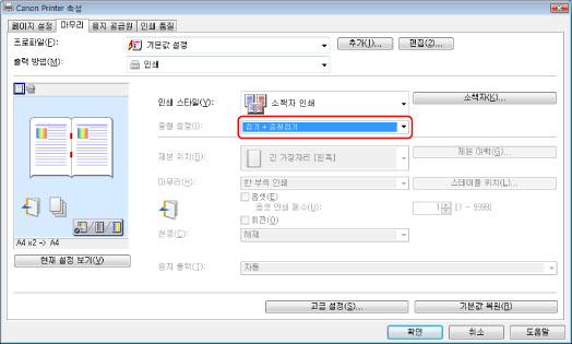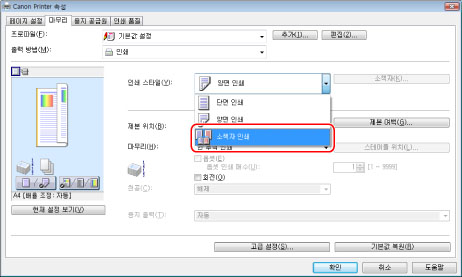 [소책자]를 클릭하면 표시되는 [소책자에 대한 세부 설정] 대화 상자에서 레이아웃과 같이 제본에 대한 세부 설정을 지정할 수 있습니다.