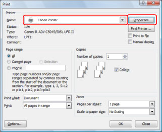 문서 인쇄에 사용 중인 응용 프로그램 소프트웨어의 [파일] 메뉴에서 [인쇄]를 선택하여 [인쇄] 대화 상자를 나타내고 → 사용할 프린터를 선택하고 → [속성]을 클릭합니다.