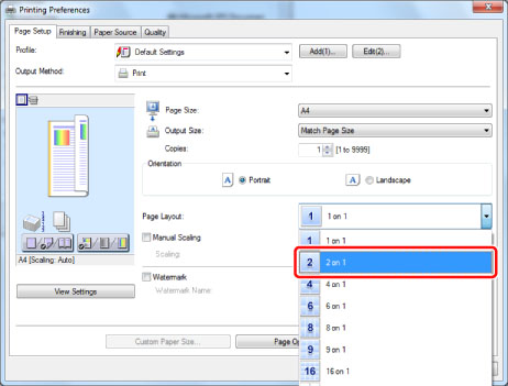 [페이지 설정] 시트의 [페이지 레이아웃]에서 [2 on 1]을 선택합니다.