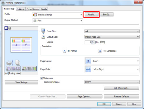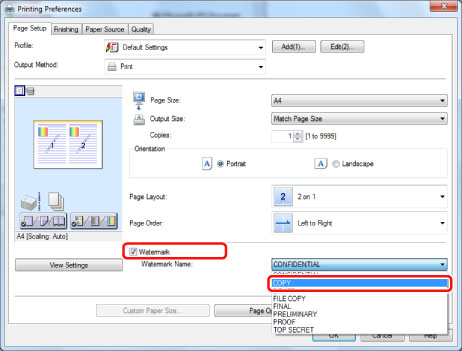 아래에서는 두 페이지를 한 장에 인쇄(2 on 1)하고 "사본(COPY)" 스탬프를 표시하는 설정을 등록하고 등록된 프로파일을 선택하여 인쇄하는 절차를 설명합니다.