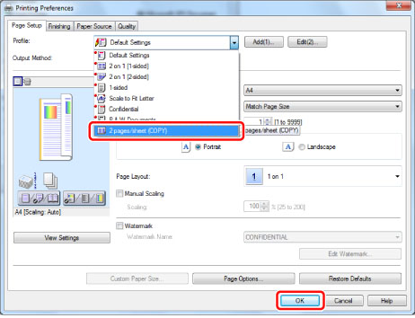 [프로파일]에서 [2 페이지/시트(COPY)]를 선택하고 → [확인]을 클릭합니다.