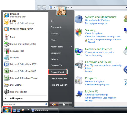 ](시작)을 클릭하고 → [제어판] → [프린터]를 선택합니다.