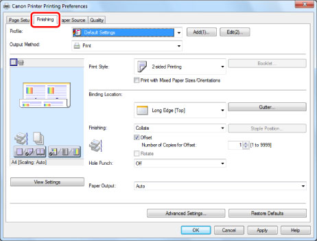 기본 인쇄 설정을 지정하여 매번 동일한 설정을 사용하여 인쇄할 수 있습니다. 예를 들어 부서의 정책이 2 on 1인쇄로만 출력하는 것이라면 기본 설정을 2 on 1 인쇄로 설정할 수 있습니다.