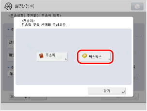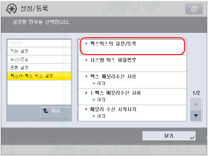 (설정/등록) → [기능 설정] → [수신/전송] → [공통 설정] → [팩스/I-팩스 박스 설정] → [팩스박스의 설정/등록]을 누릅니다.