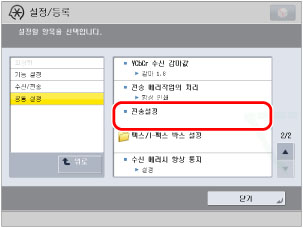 (설정/등록) → [기능 설정] → [수신/전송] → [공통 설정] → [전송설정]을 누릅니다.