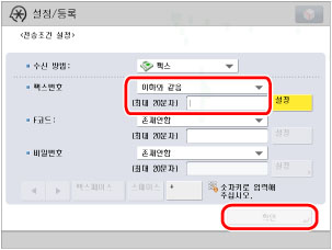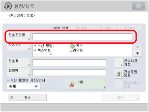 [전송조건]을 누르고 → 수신 방법에 대해 [팩스: 회선1]을 선택합니다.