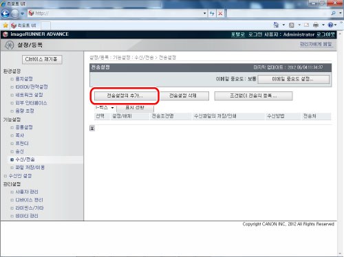 리모트 UI에 액세스하고 → [설정/등록] → [수신/전송] → [전송설정]을 클릭합니다.