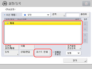 인쇄할 전송 조건을 선택하고 → [리스트 인쇄]를 누릅니다.