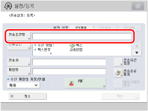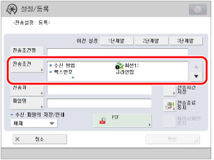 [전송조건명]을 누르고 → 지정된 조건의 이름을 입력하고 → [확인]을 누릅니다.