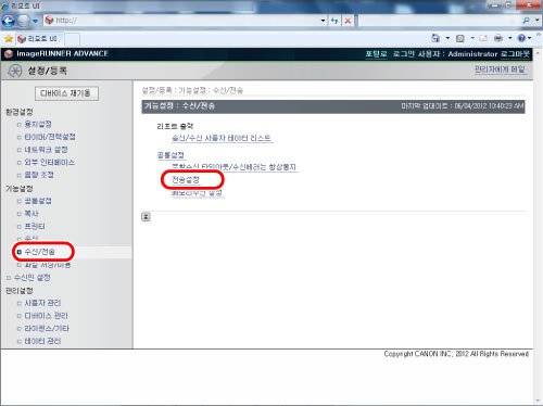 리모트 UI에 액세스하고 → [설정/등록] → [수신/전송] → [전송설정]을 클릭합니다.