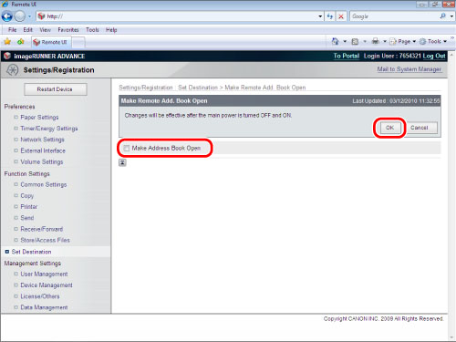 리모트 UI에 액세스하고 → [설정/등록] → [수신인 설정] → [리모트 주소록 공개 설정]을 클릭합니다.