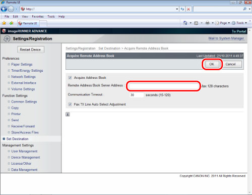리모트 UI에 액세스하고 → [설정/등록] → [수신인 설정] → [리모트 주소록 취득 설정]을 클릭합니다.