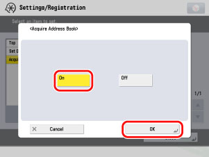 (설정/등록) → [수신인 설정] → [리모트 주소록 취득 설정] → [주소록 취득]을 누릅니다.
