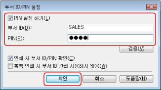 [인쇄 시 부서 ID/PIN 확인]을 선택하여 기기에 저장된 정보와 인증 시점을 설정합니다.