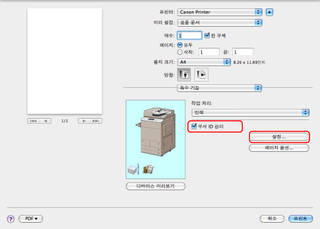 작업 계정 기능이 설정된 컬러 프린터를 사용하여 흑백으로 인쇄할 때 [흑백 인쇄 시 부서 ID 관리 사용하지 않음]을 선택할 경우 문서가 페이지 카운트에서 제외됩니다. 작업 계정 기능을 사용하는 경우 기기의 [흑백 인쇄 작업 허용]을 '설정'으로 설정합니다.