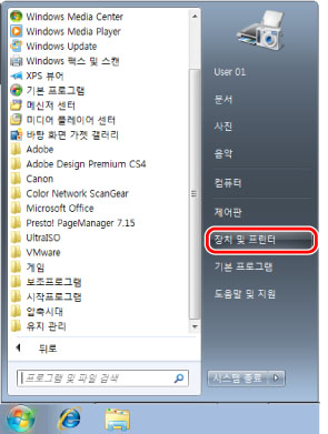 ](시작)을 클릭하고 → [제어판] → [프린터]를 선택합니다. Windows 7의 경우 [
