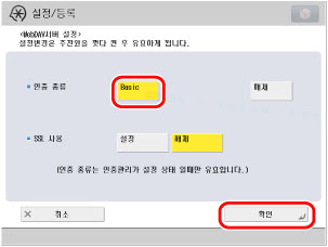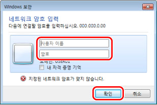 "사용자 정보 등록"의 5단계에서 설정한 사용자 이름 및 비밀번호를 입력하고 → [확인]을 누릅니다.