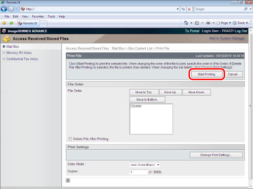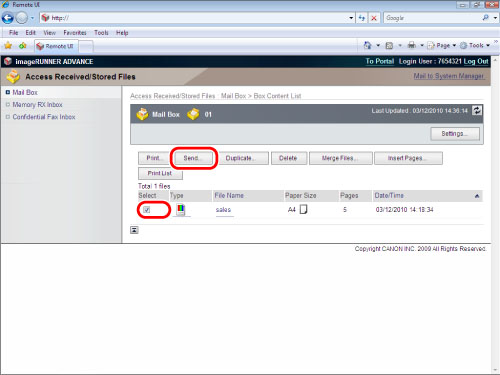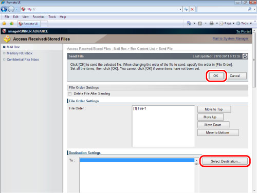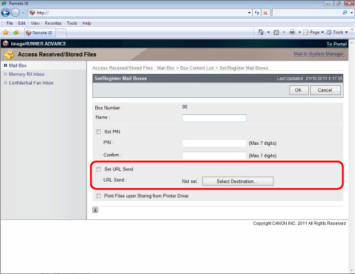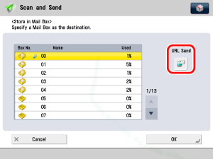 리모트 UI에 액세스하고 → [수신/저장 파일 이용] → [박스]을 클릭한 후 → URL 송신을 설정할 박스의 번호를 클릭합니다.