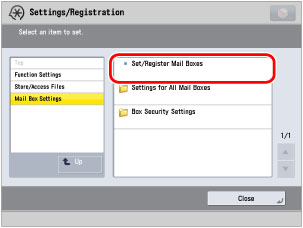 (설정/등록) → [기능 설정] → [파일 저장/이용] → [박스 설정] → [박스 설정/등록]를 누릅니다. |