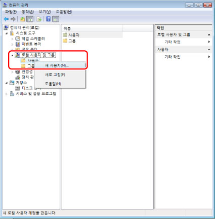 (시작)을 클릭하고 → [컴퓨터]를 오른쪽 클릭하고 → [관리] → [컴퓨터 관리(로컬)] → [시스템 도구] → [로컬 사용자 및 그룹]을 클릭하고 → [사용자]를 오른쪽 클릭하고 → [새 사용자]를 선택합니다.