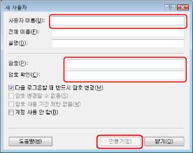 [새 사용자] 대화 상자에서 [사용자 이름], [암호], [암호확인]을 입력하고 → [만들기]를 클릭합니다.
