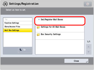 (설정/등록) → [기능 설정] → [파일 저장/이용] → [박스 설정] → [박스 설정/등록]를 누릅니다.