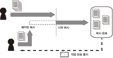 기기가 작업을 처리 중인 경우 현재 작업이 완료될 때까지 새 작업을 시작할 수 없습니다. 예를 들어 대용량 복사 작업을 처리 중인 경우 복사 작업이 완전히 완료될 때까지 기다려야 합니다. 이 경우 예약 복사 모드를 사용하여 복사 작업을 처리하는 동안 원고를 스캔하고 현재 작업이 완료된 후 바로 복사를 시작할 수 있습니다. 또한 복사 작업이 완료될 때 알림을 받도록 지정하면 복사 작업을 효율적으로 처리하는 데 도움을 줍니다.