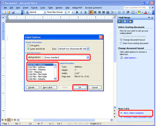 [제품 번호]에서 레이블 크기를 선택하고 → [확인] → [다음]을 선택합니다.