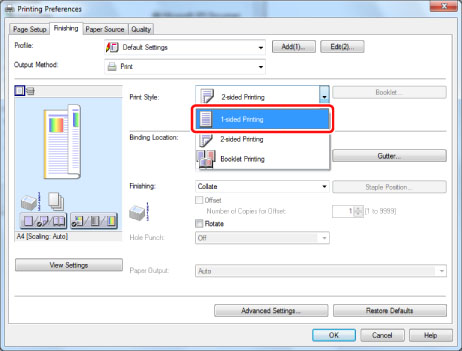 [마무리] 시트의 [인쇄 스타일]에서 [단면 인쇄]를 선택합니다.