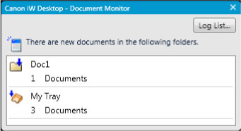 Document Monitor를 사용하여 Hot Folder의 대상 폴더를 모니터할 수 있습니다. iW Desktop으로 모니터할 폴더를 구성하고 새 폴더에 대한 통지를 활성화하면, 문서가 Hot Folder에서 대상 폴더로 전송될 때 새 문서 통지 아이콘과 창이 나타납니다.