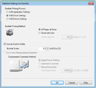 [Detailed Settings for Booklet] 대화 상자의 [Booklet Printing Process] 아래에서 [With Device Settings]을 선택하면 이동(creep) 교정 기능을 사용할 수 있습니다.