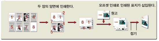 중철 후 페이지 순서에 따라 지정된 크기와 방향의 출력 용지당 원고 페이지 두 페이지씩 페이지를 자동으로 정판할 수 있습니다.