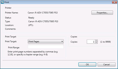 [Print Target]에서 [Document (All Pages)] 또는 [Print Pages]을 선택합니다.