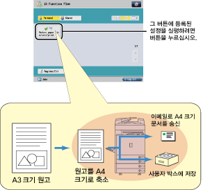 예를 들어 박스에 파일의 백업을 저장하는 동시에 A3 원고를 스캔하여 A4 크기로 축소한 다음 이메일을 통해 파일을 송신할 수 있습니다. 이 모든 작업이 플로우 버튼 하나만 누르면 수행됩니다.
